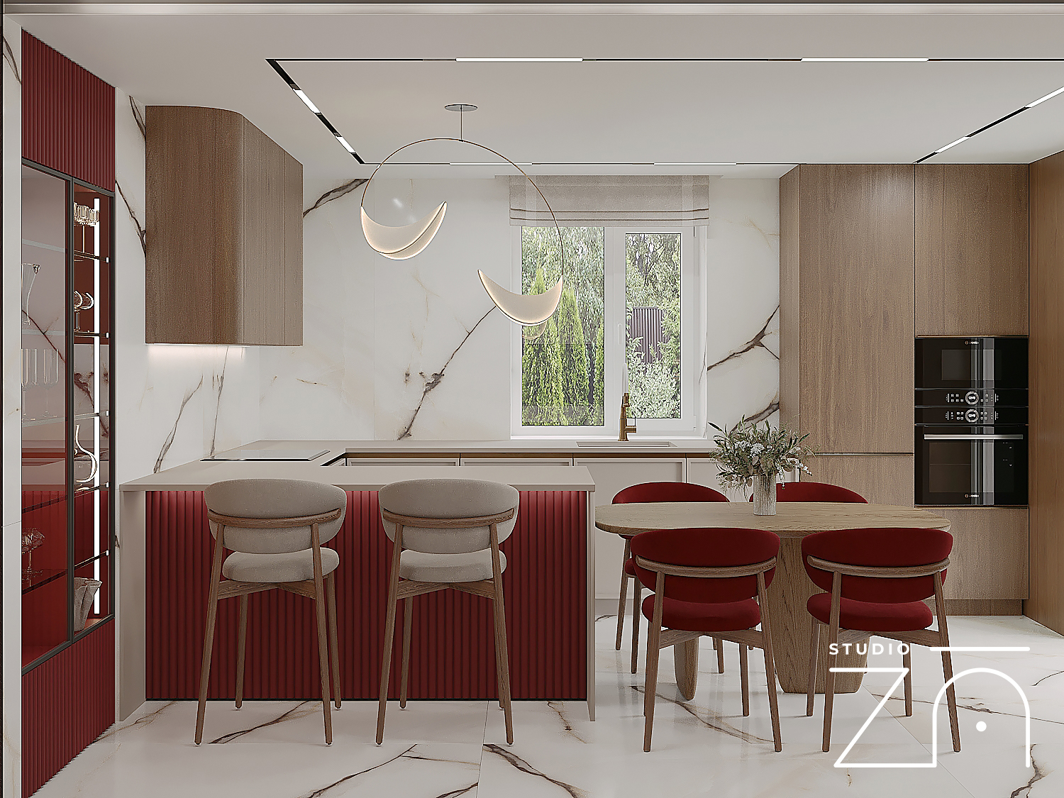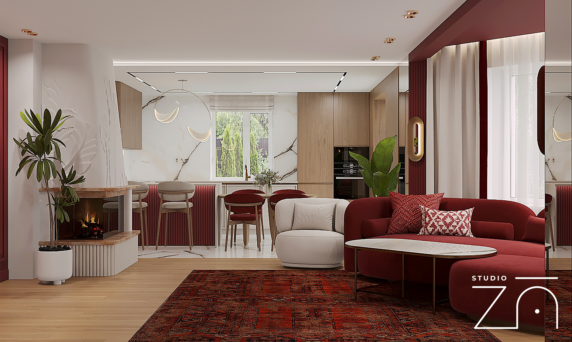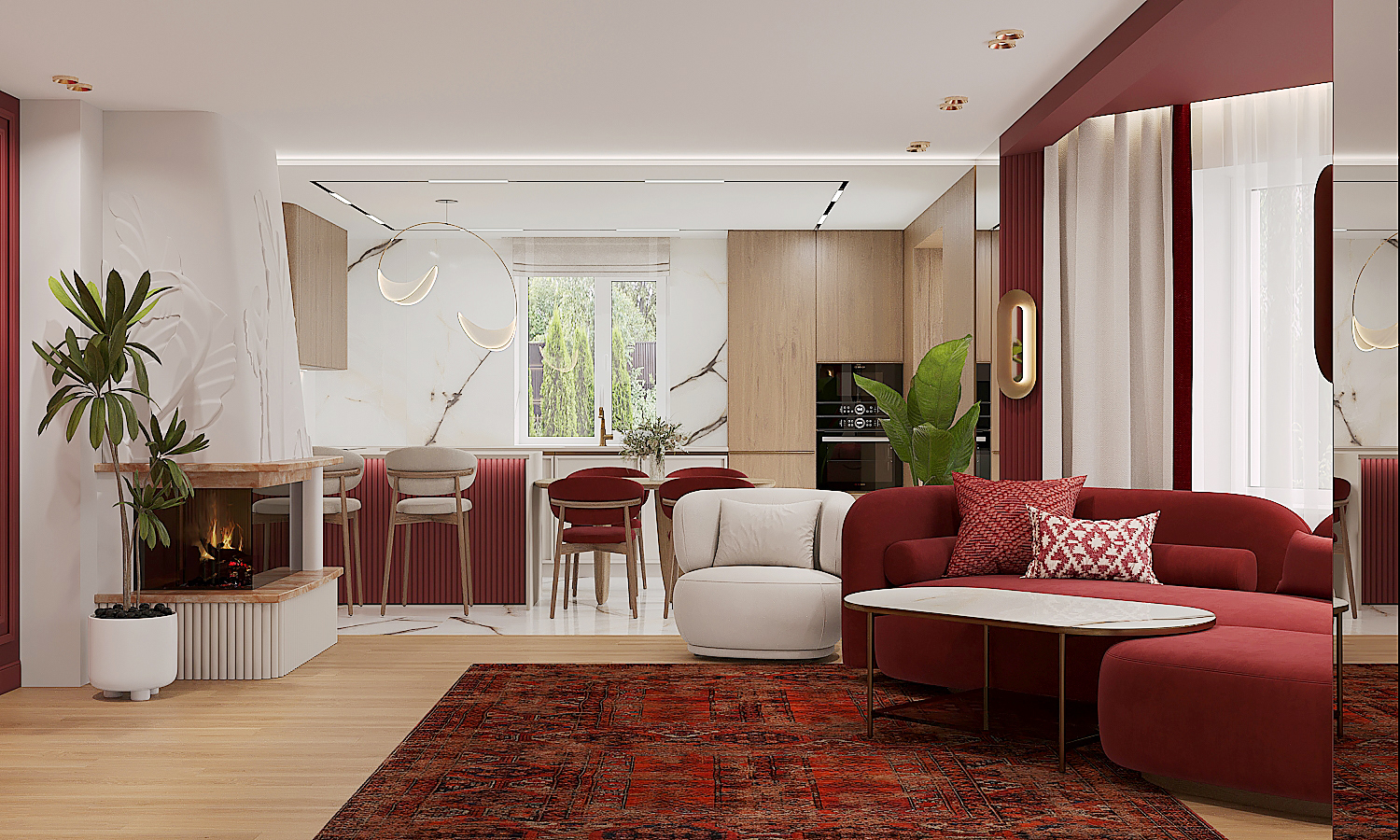 Интерьер загородного дома объединяет в себе роскошь и глубину цвета бургунди со свежестью молочных оттенков керамогранита и текстурой натурального дерева в инженерной доске и элементах мебели.