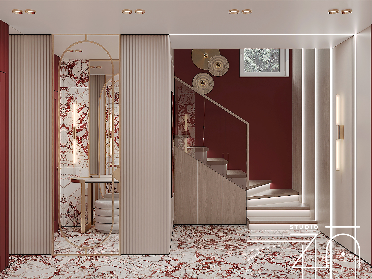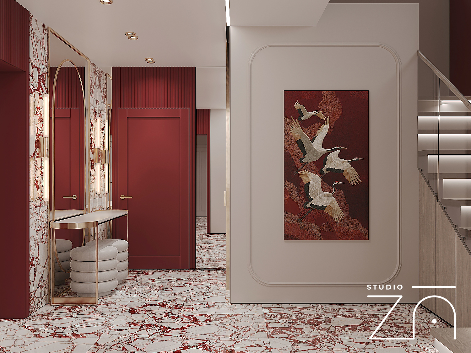 Парадный холл обретает атмосферу театральности за счет сочетания яркого принта и локального освещения. В прихожую удалось интегрировать полноценную гардеробную комнату, не смотря на лестничный марш рядом с входной группой.