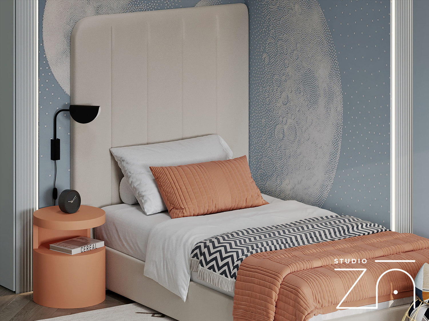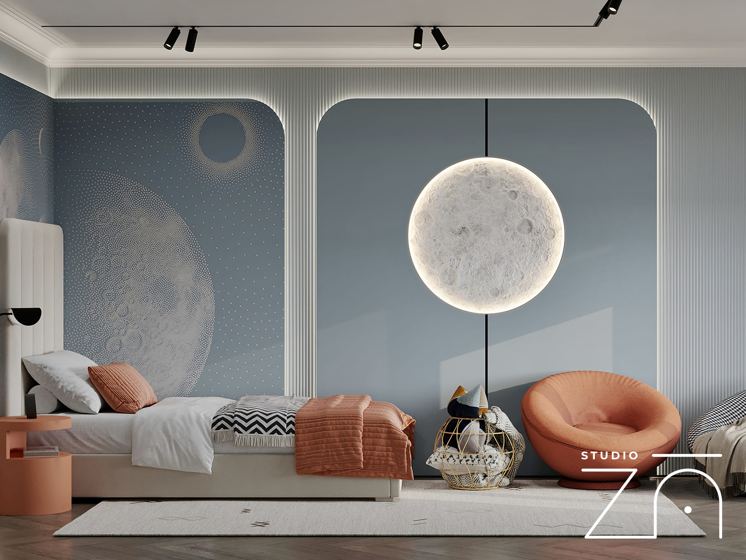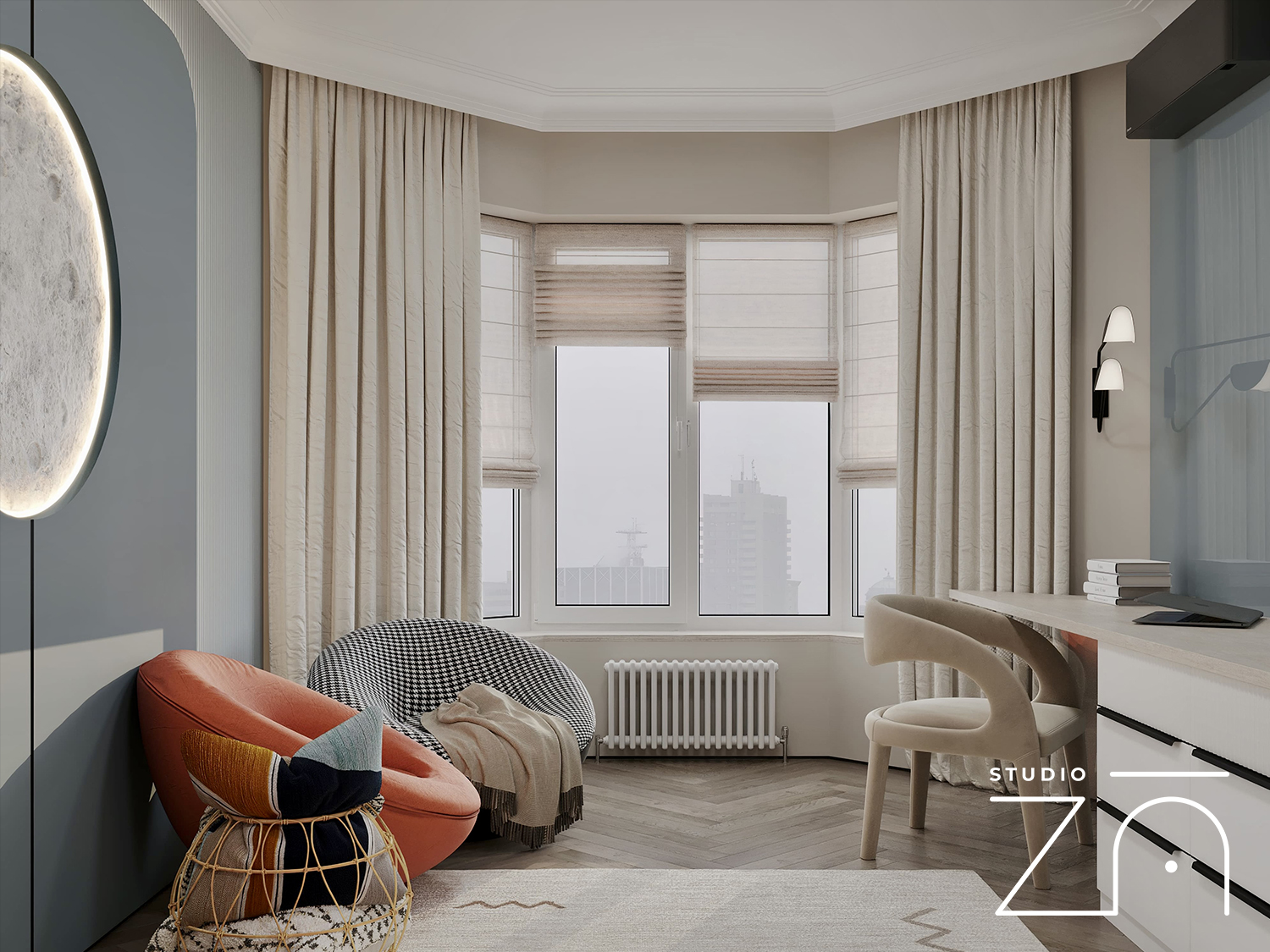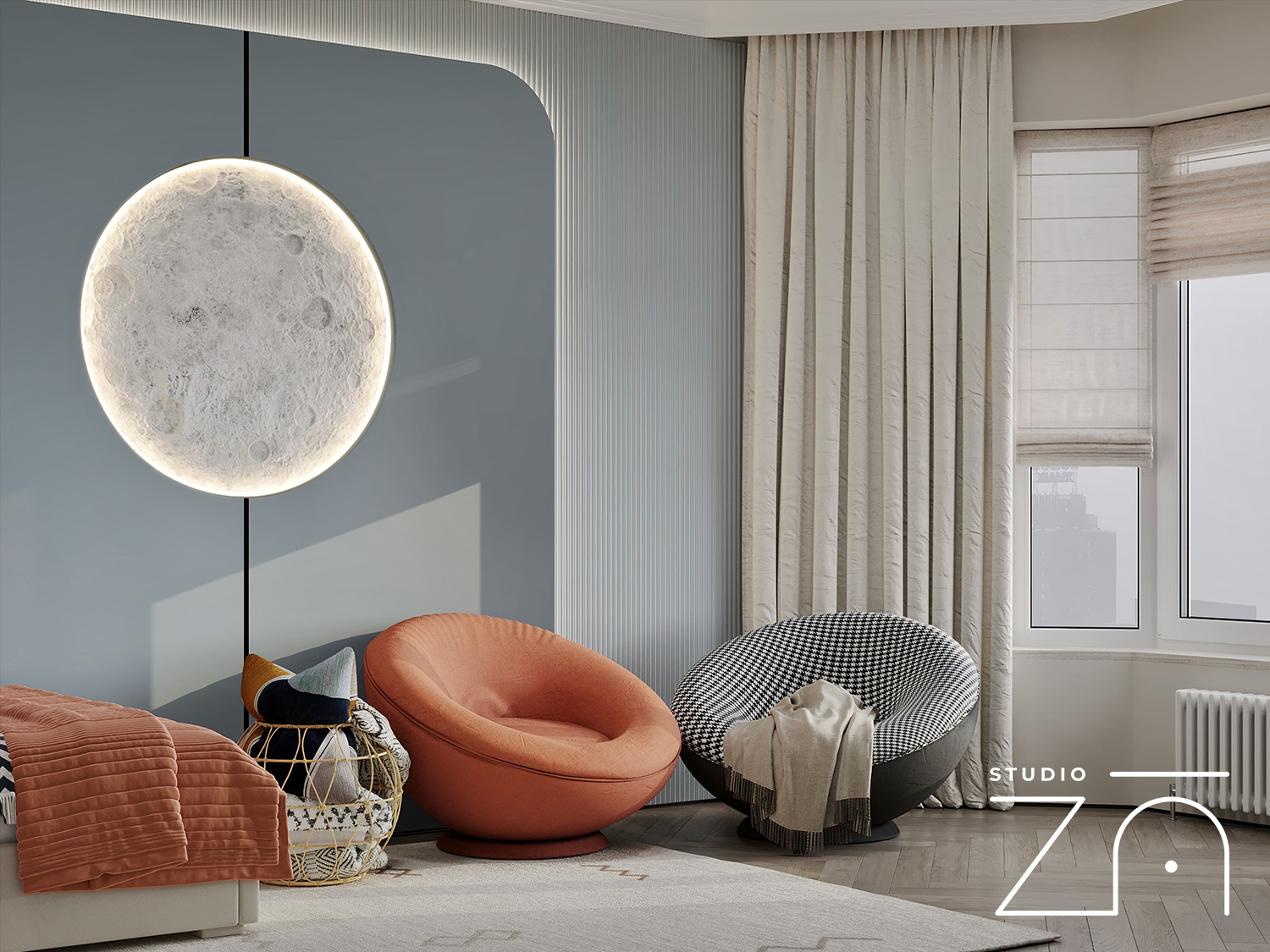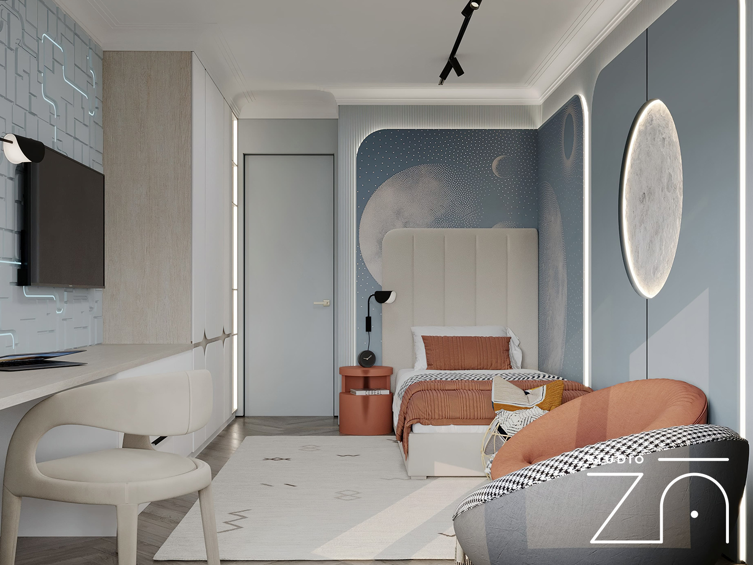 Стилистика детской комнаты для мальчика — намек на футуризм и космос. В спальне царит атмосфера дорогого отеля, а в кухне-гостиной — мягкий шик монохромного интерьера разбавлен геометрией деталей отделки.