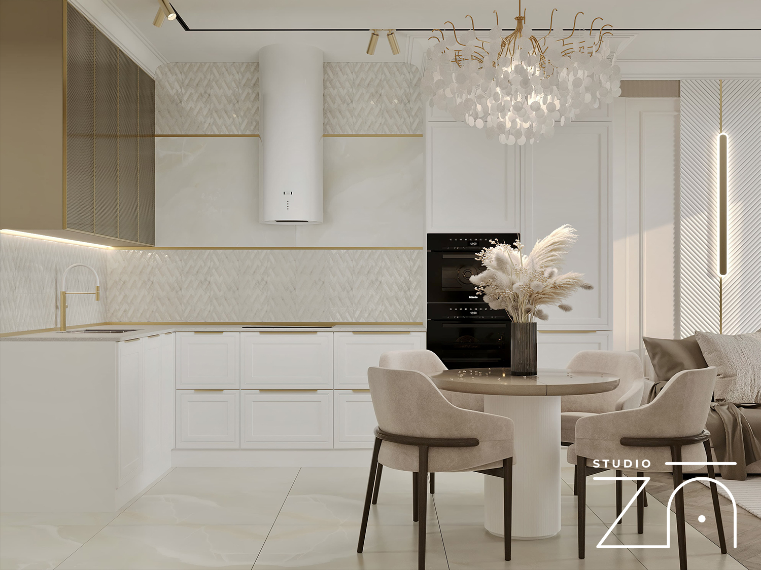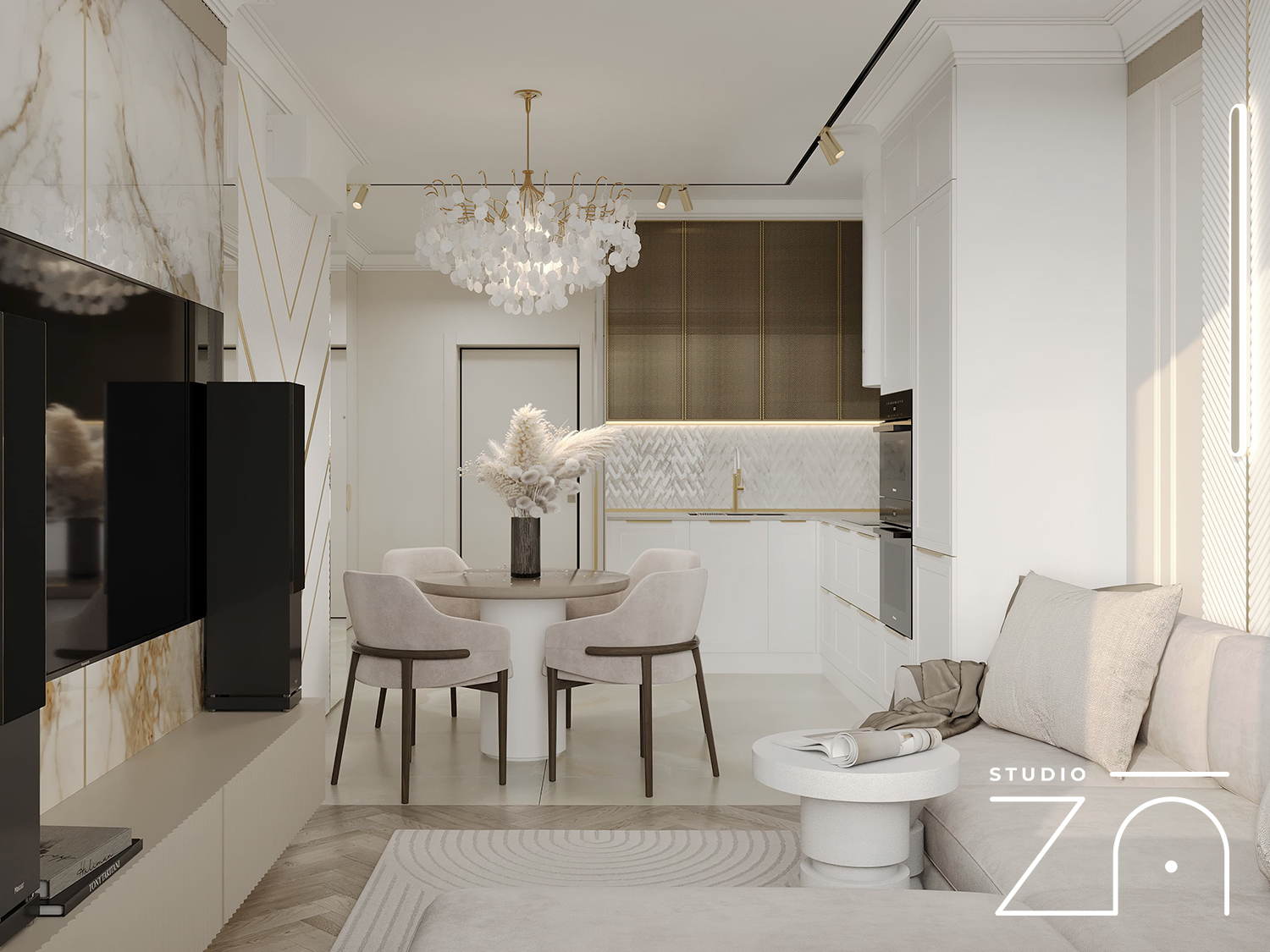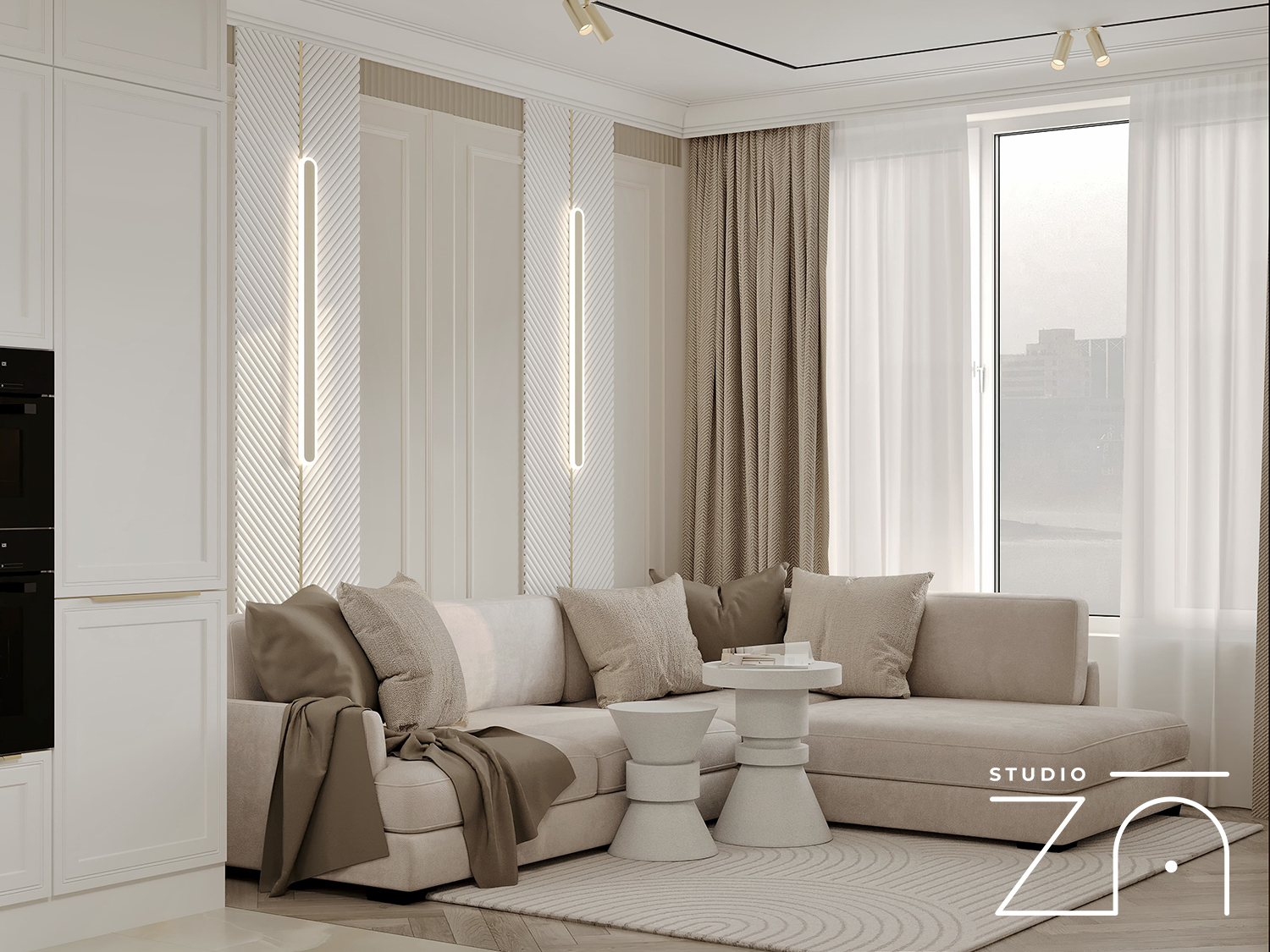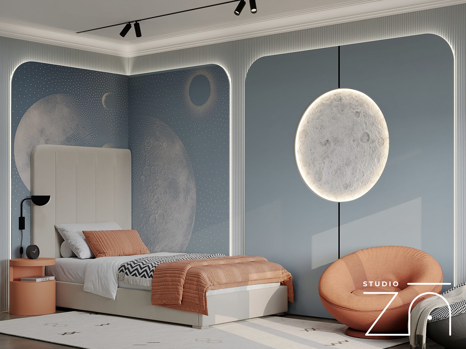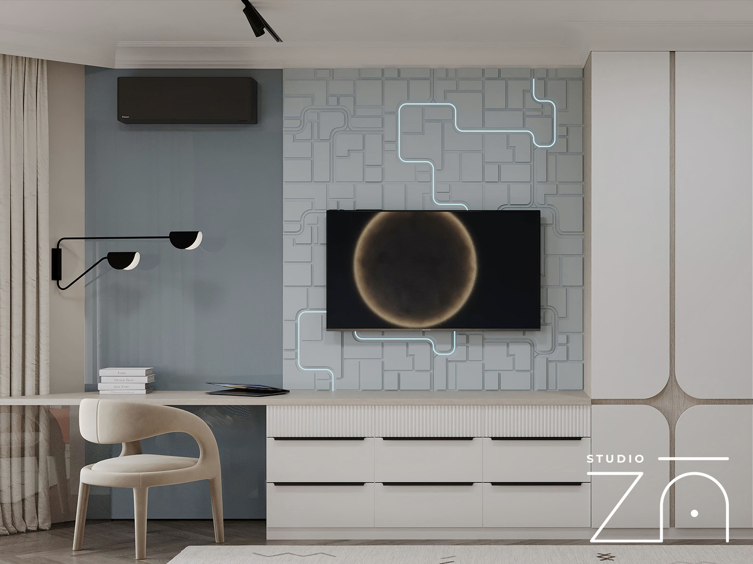 Стилистика детской комнаты для мальчика — намек на футуризм и космос. В спальне царит атмосфера дорогого отеля, а в кухне-гостиной — мягкий шик монохромного интерьера разбавлен геометрией деталей отделки.