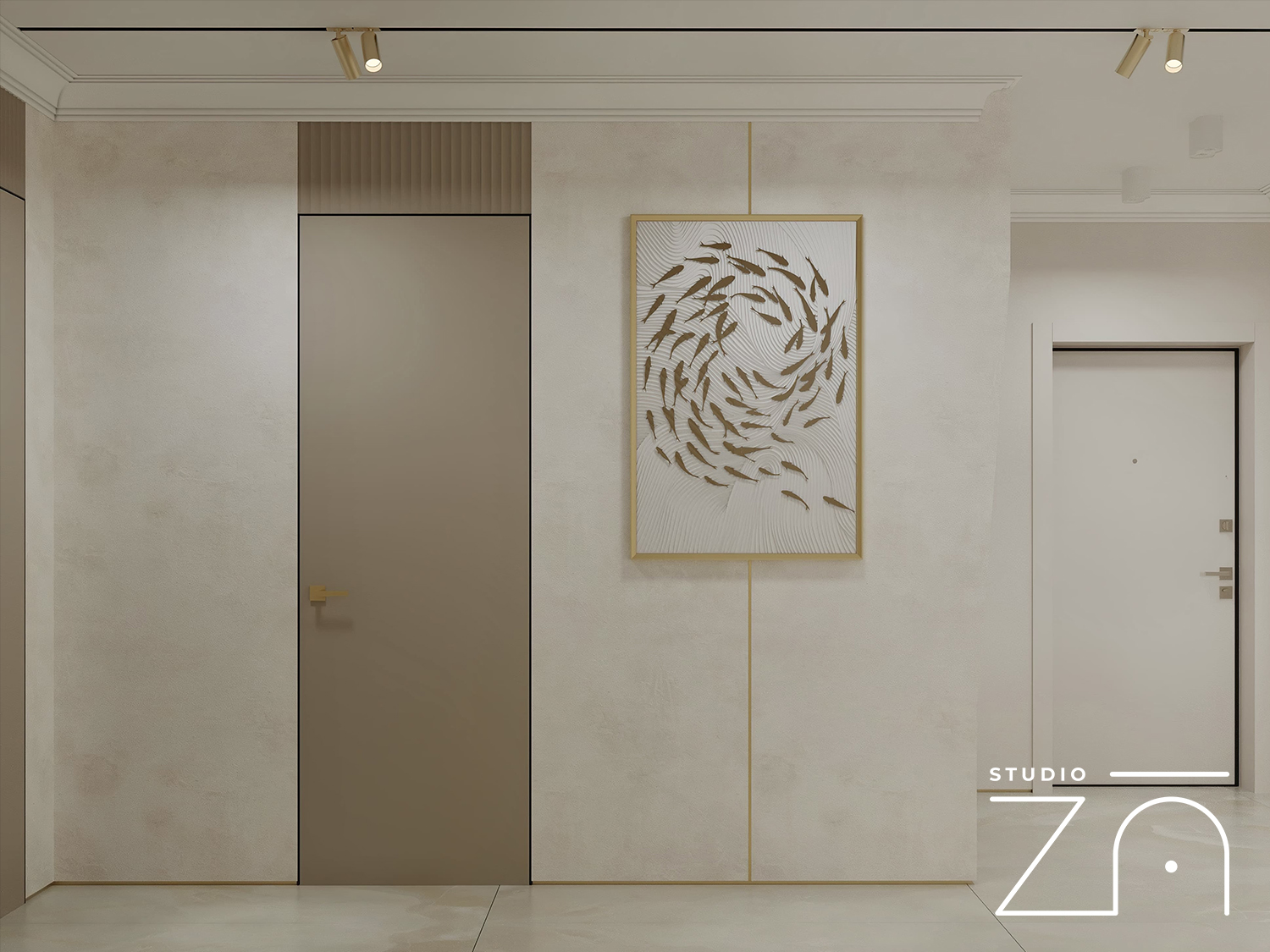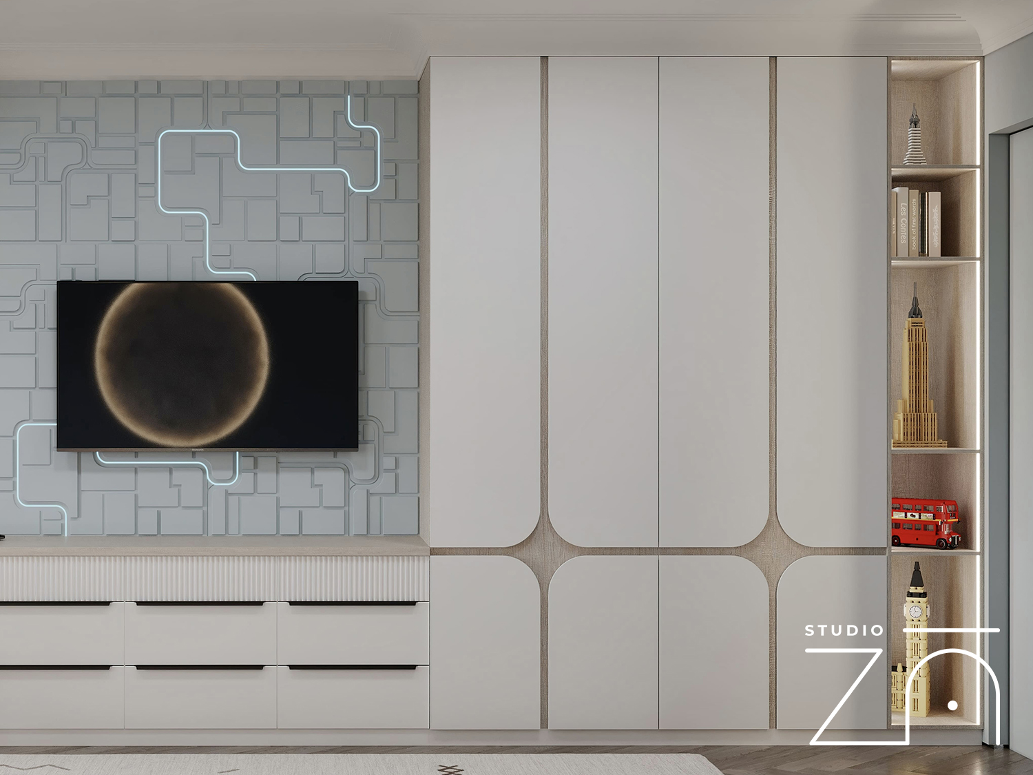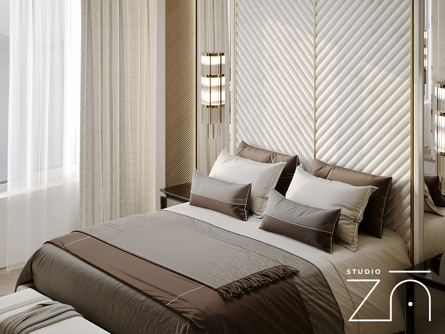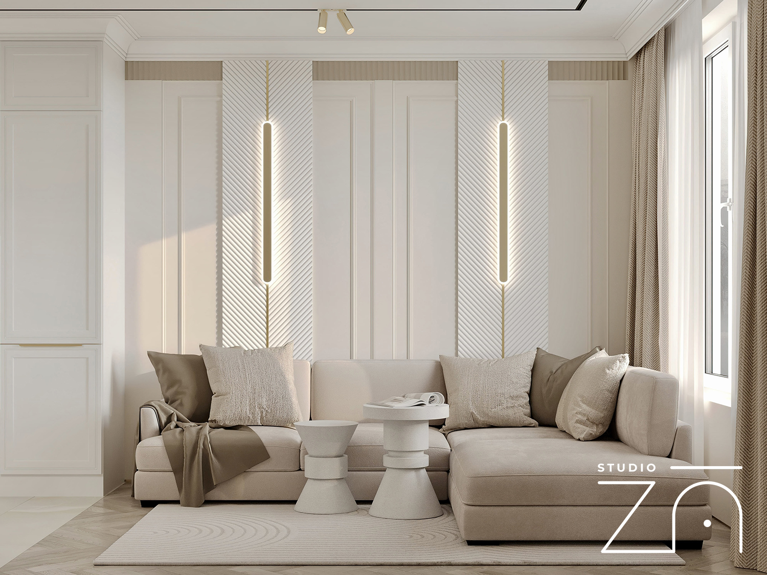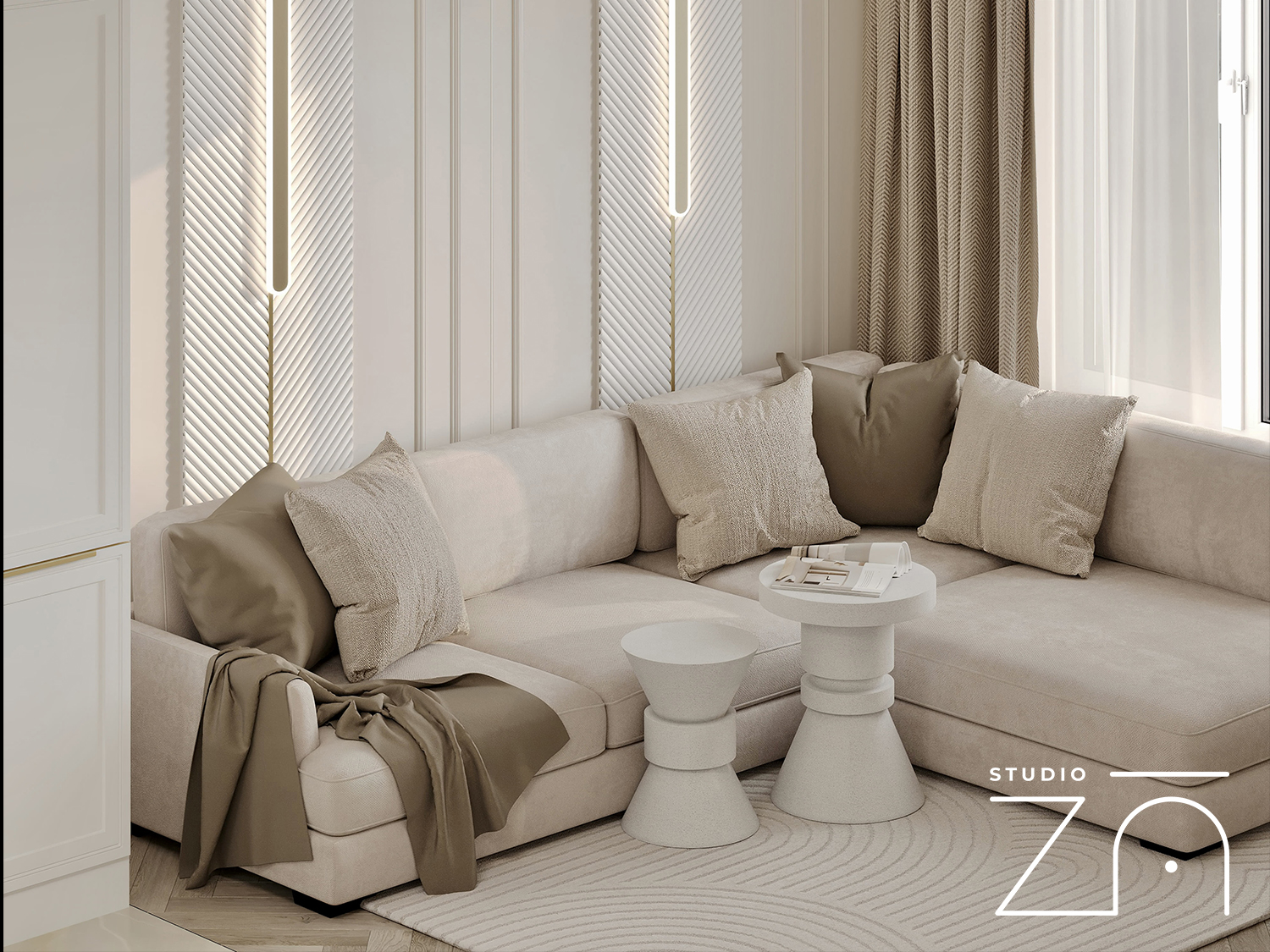 Стилистика детской комнаты для мальчика — намек на футуризм и космос. В спальне царит атмосфера дорогого отеля, а в кухне-гостиной — мягкий шик монохромного интерьера разбавлен геометрией деталей отделки.