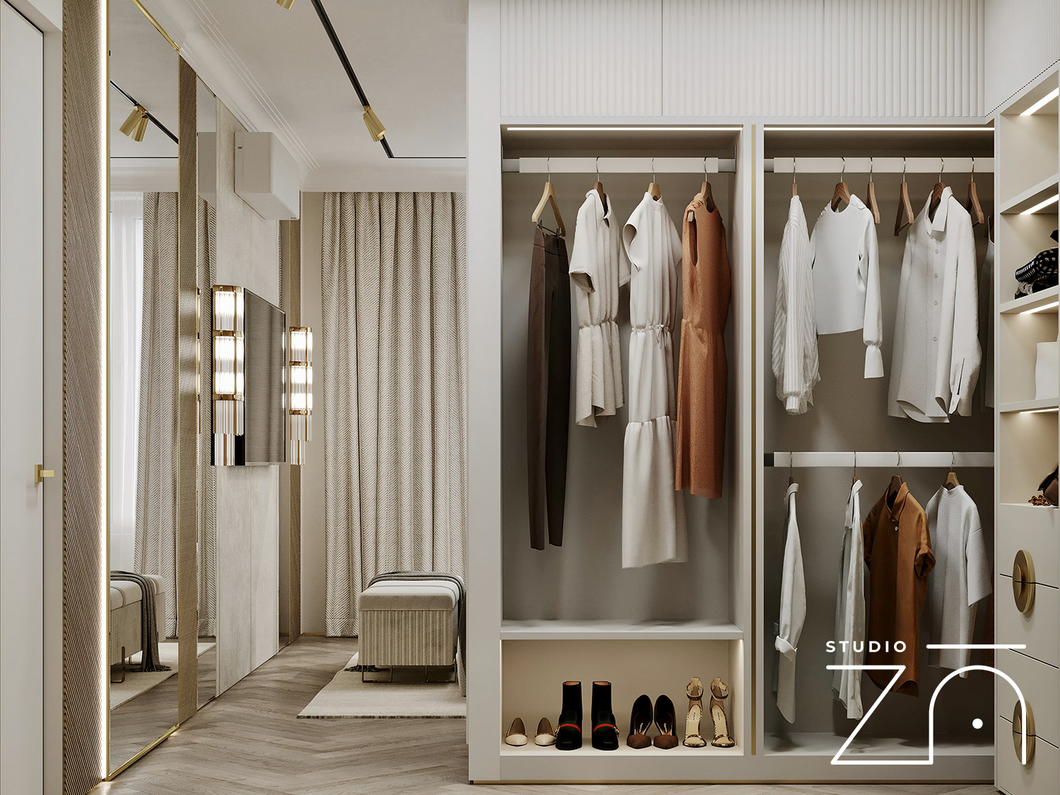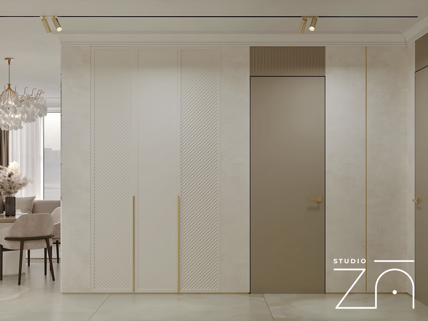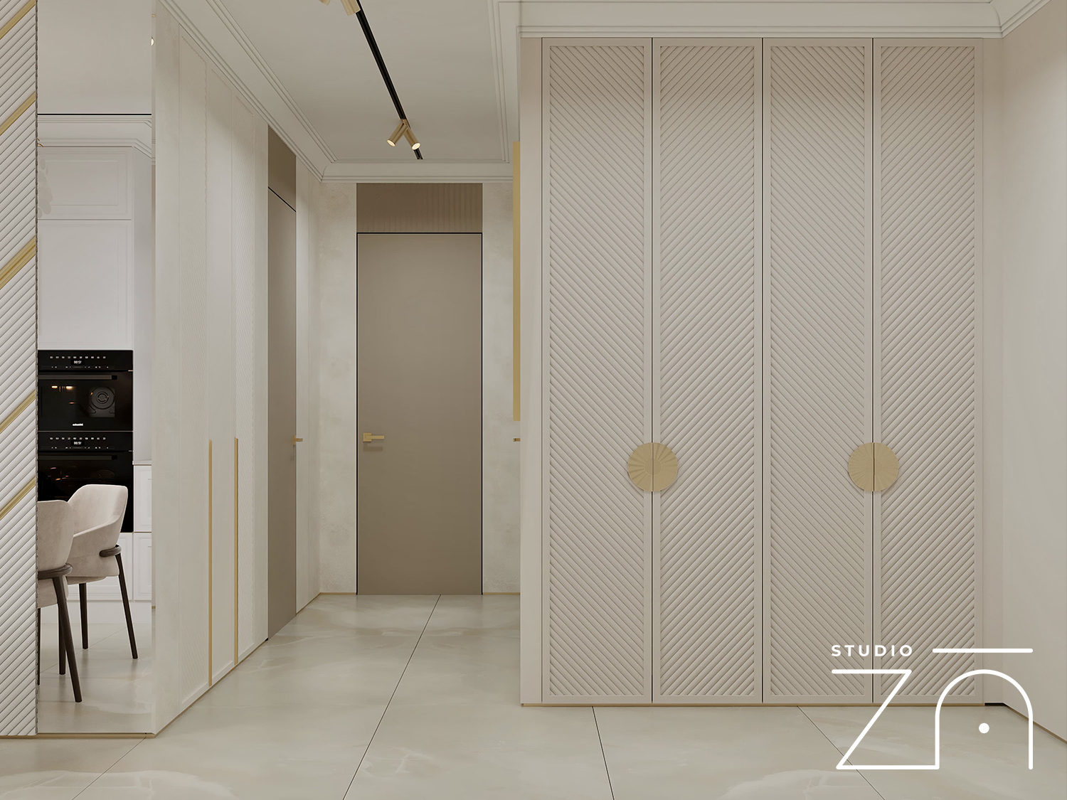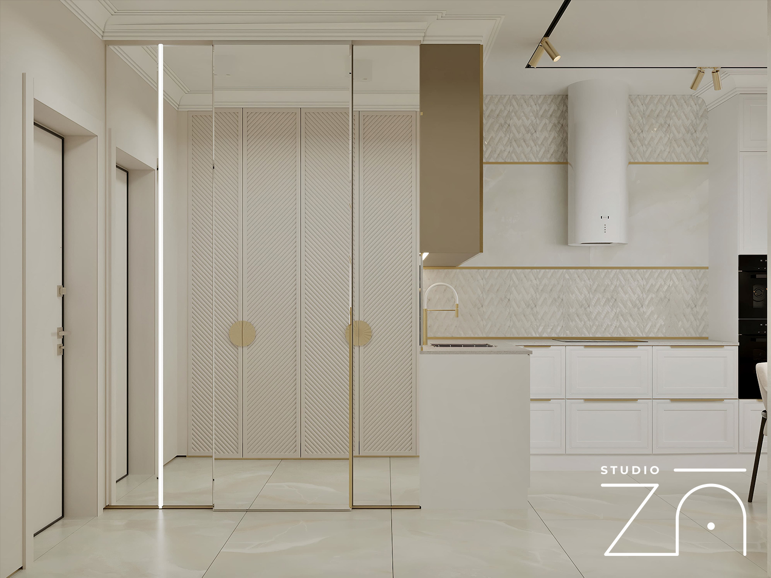 Планировка данной квартиры имеет жесткую структуру несущих стен, поэтому тут мы использовали максимально приемы по визуальному расширению пространства в зоне кухни-гостиной. В детской осталась эркерная часть, характерная для данного жилого комплекса. А в спальне удалось разместить полноценную гардеробную и вход в собственный санузел.