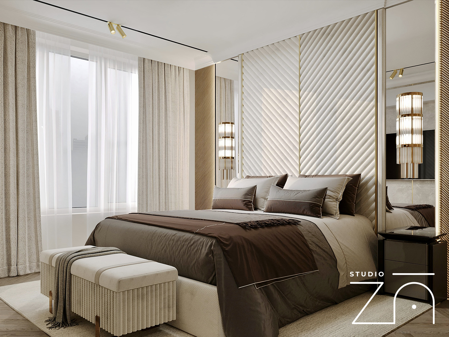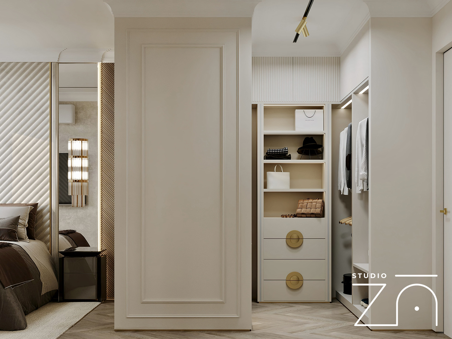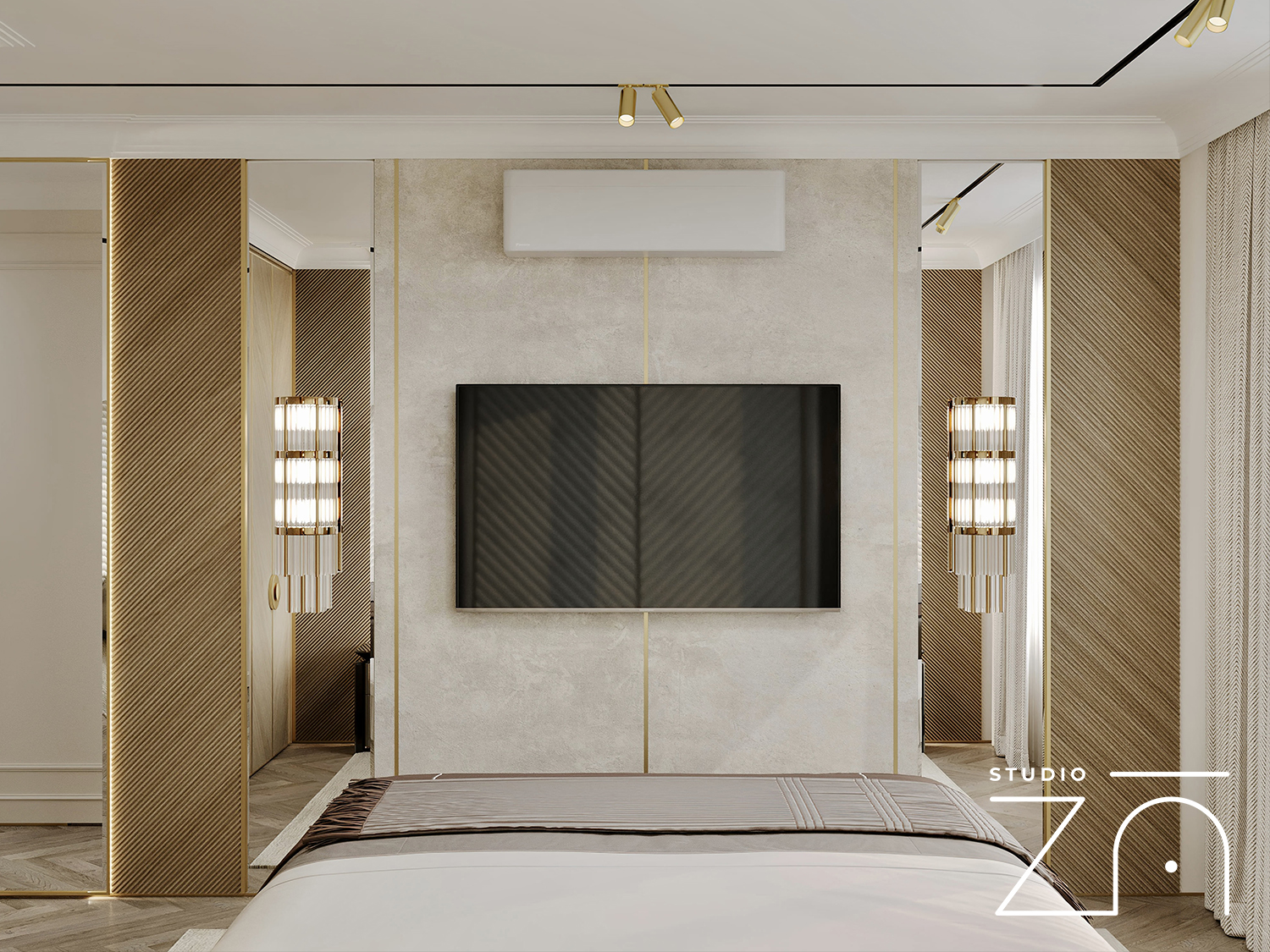 Планировка данной квартиры имеет жесткую структуру несущих стен, поэтому тут мы использовали максимально приемы по визуальному расширению пространства в зоне кухни-гостиной. В детской осталась эркерная часть, характерная для данного жилого комплекса. А в спальне удалось разместить полноценную гардеробную и вход в собственный санузел.