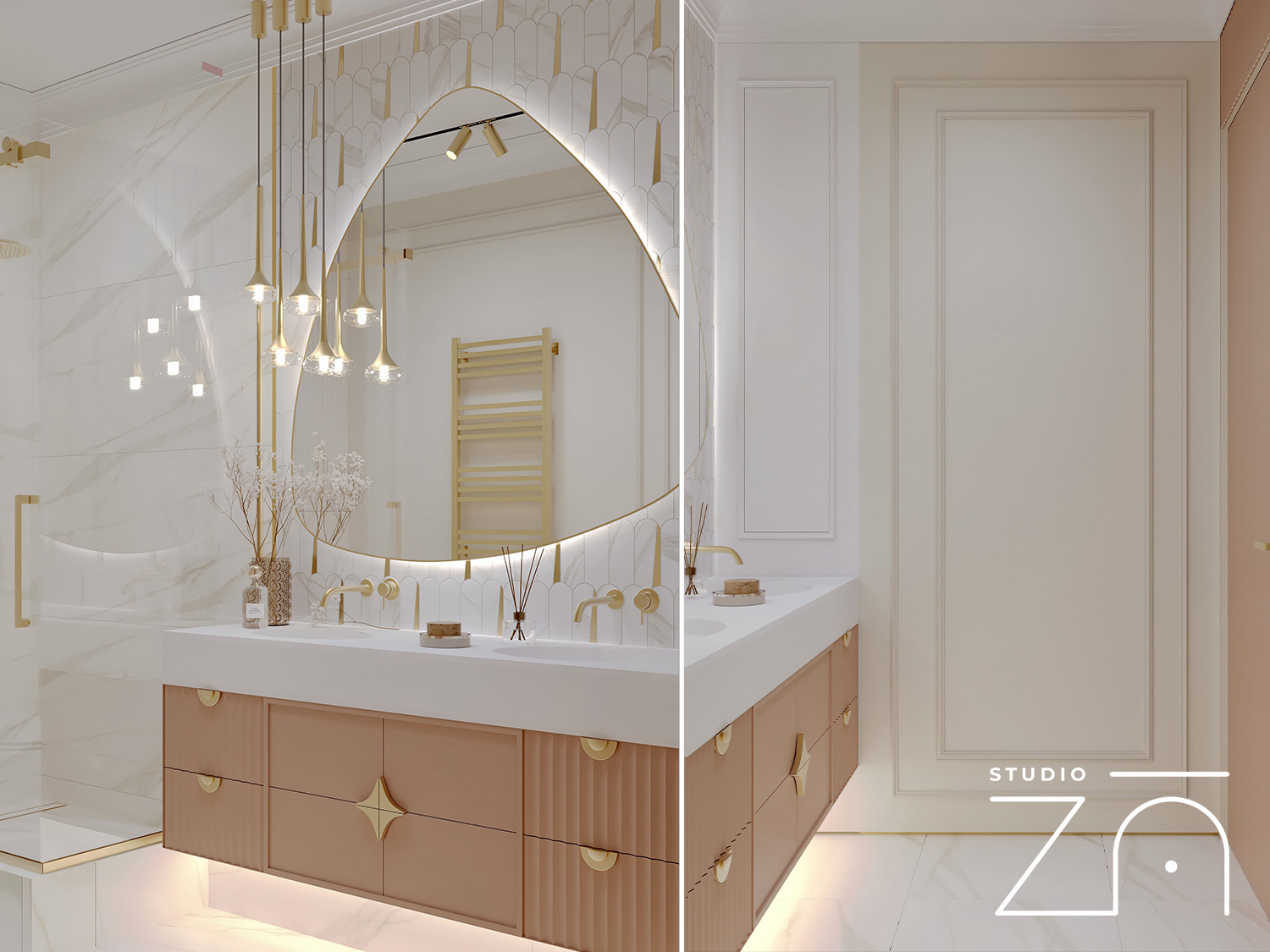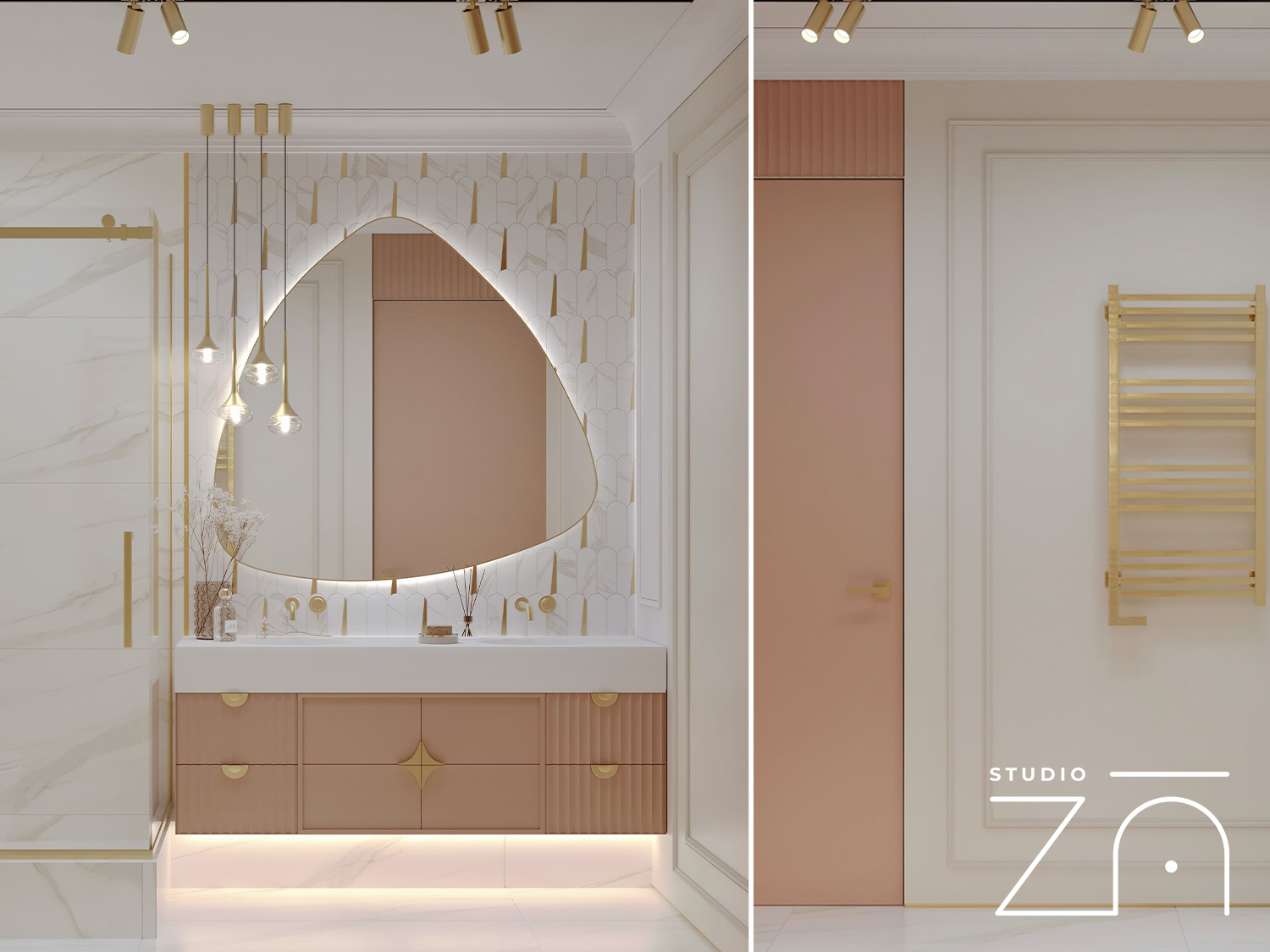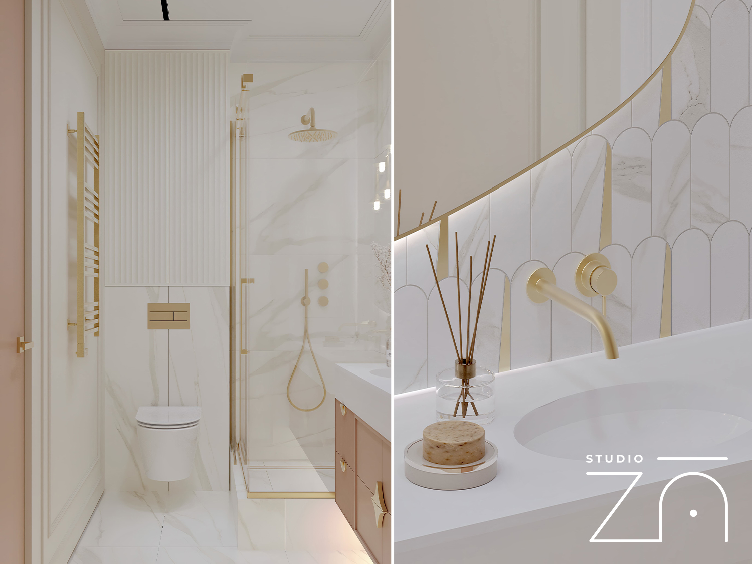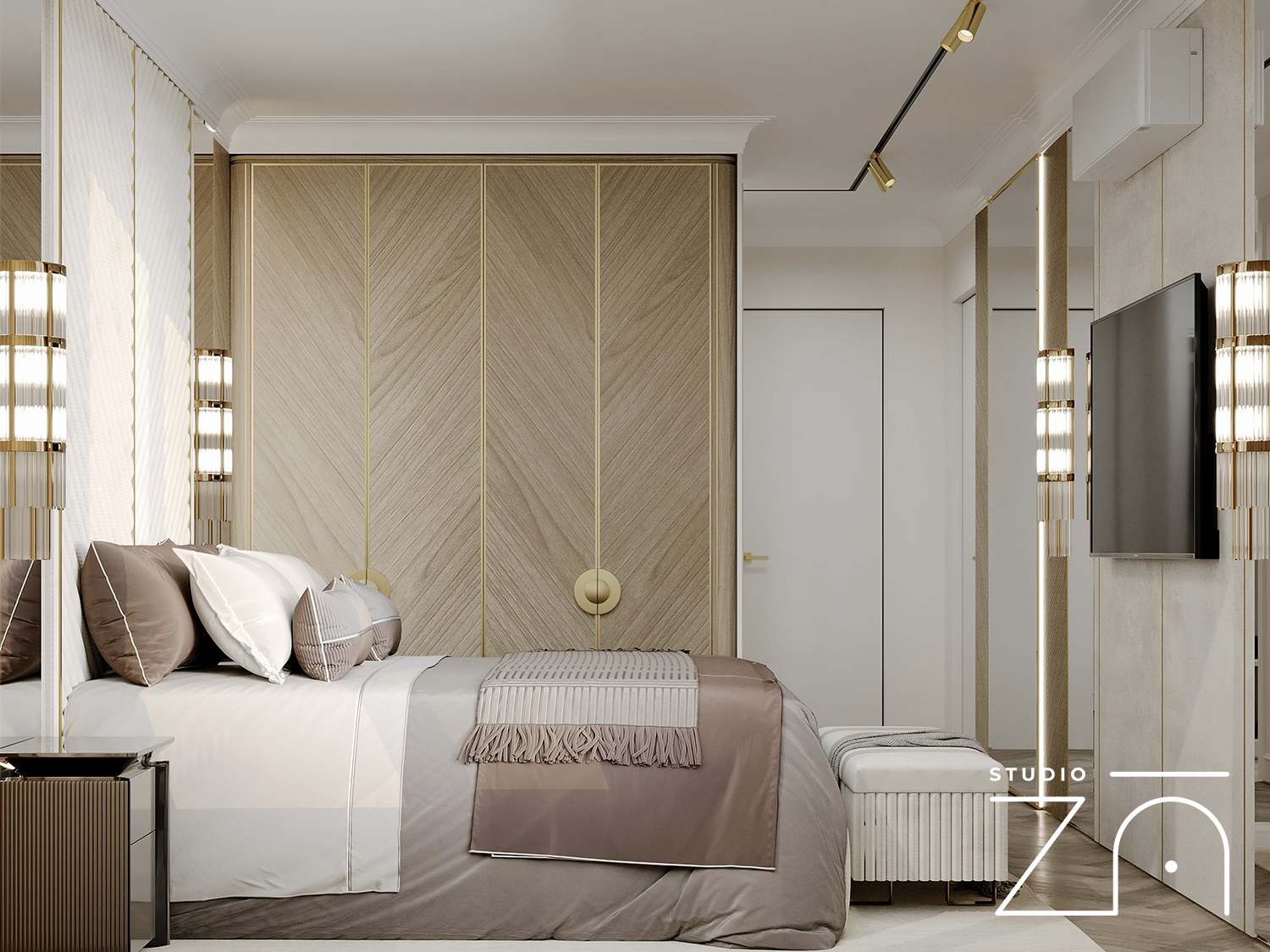 Планировка данной квартиры имеет жесткую структуру несущих стен, поэтому тут мы использовали максимально приемы по визуальному расширению пространства в зоне кухни-гостиной. В детской осталась эркерная часть, характерная для данного жилого комплекса. А в спальне удалось разместить полноценную гардеробную и вход в собственный санузел.